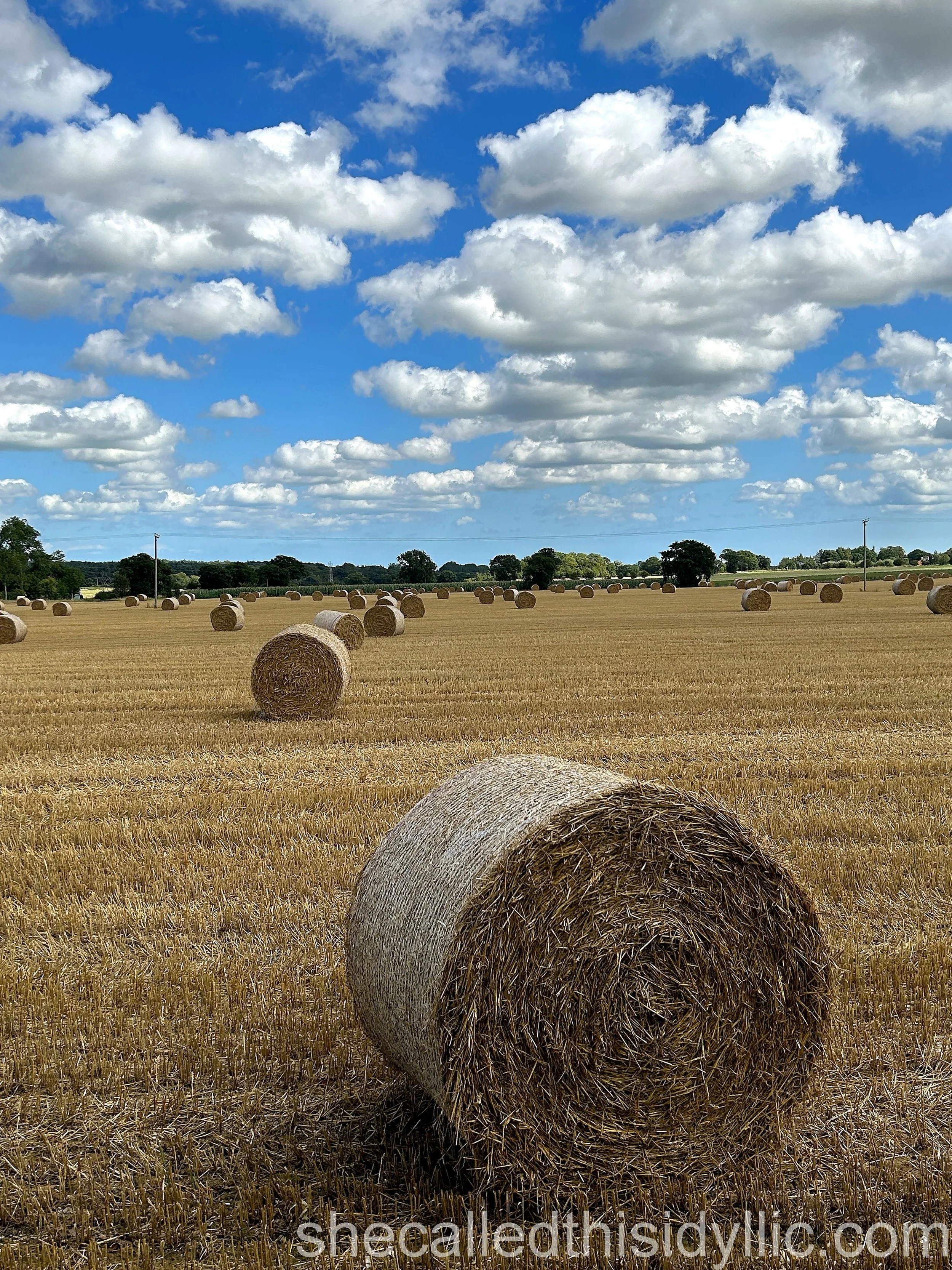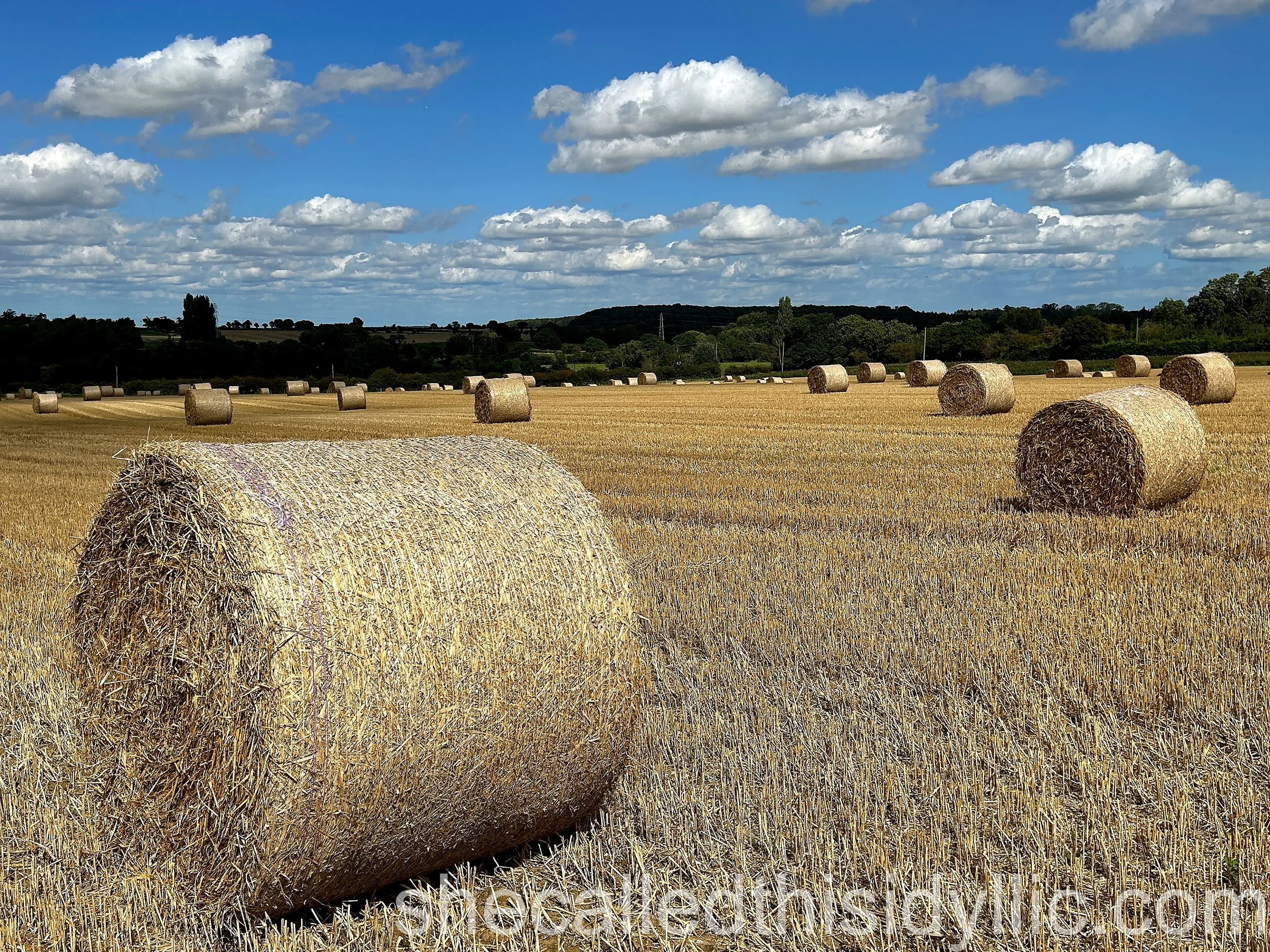 Circular bales of hay, random deposits on the semi-harvested landscape like the aftermath of battles, contrasting the luminous white clouds hanging in the wide Norfolk sky, drifting on the late summer breeze.